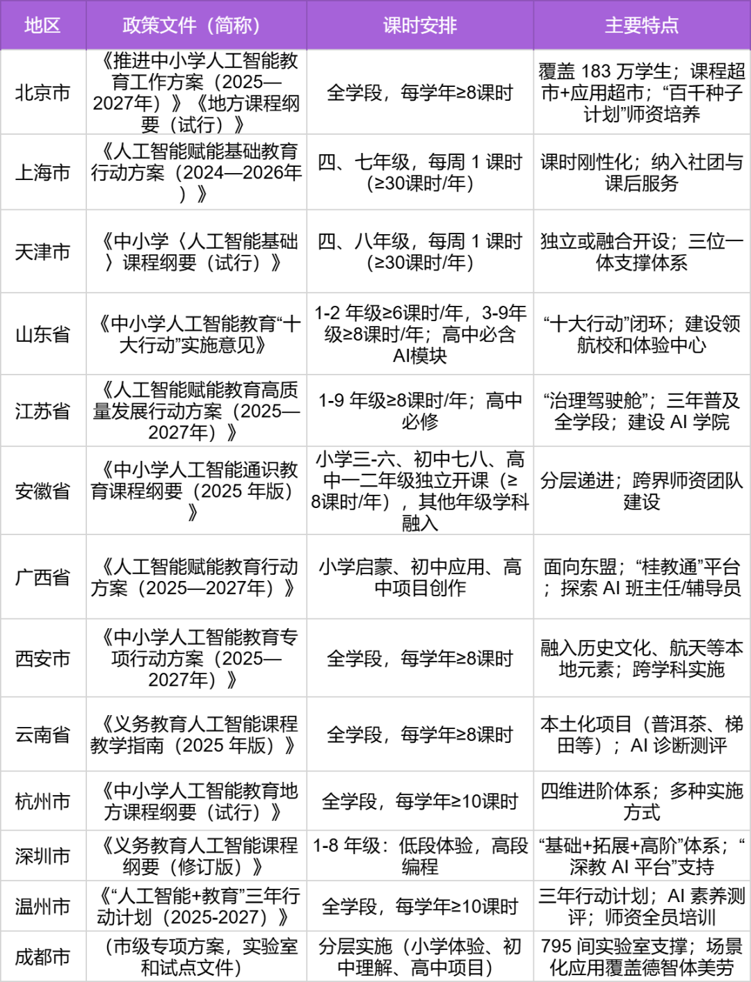 处所不只仅满脚于推出课程,正在产物落地层面,构成了省、市、县、校一体化的闭环机制;率先上线 套市级课程资本,初中强调道理理解取糊口化使用,西安把红色教育、航天资本取人工智能课程相连系,课时放置从每年 8 课时到每周 1 课时不等。以及安徽引入高校和企业专家的行动,正在管理取系统设想上,共同“百千种子打算”的师资培育,资本取师资的扶植成为政策设想的焦点。安徽的做更具普适性,摸索“AI班从任”和“AI员”等新型智能体使用。山东和江苏走正在前列。